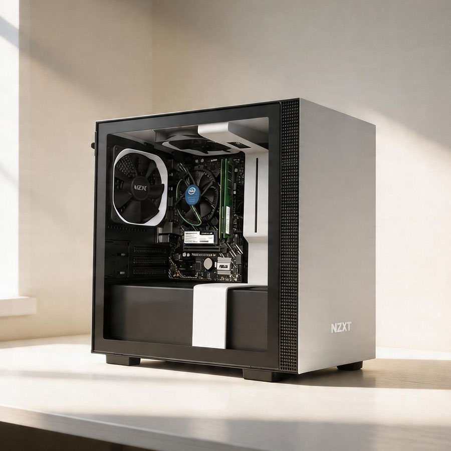 Thiết kế Small Form Factor (SFF) tinh tế Sự khác biệt lớn nhất của bộ máy này chính là vỏ case NZXT H210i White. Với kích thước nhỏ gọn và thiết kế tối giản đặc trưng của NZXT, bộ máy không chiếm nhiều diện tích bàn làm việc nhưng vẫn là điểm nhấn thẩm mỹ cực cao. Mặt kính cường lực cho phép anh quan sát trọn vẹn các linh kiện cao cấp bên trong.